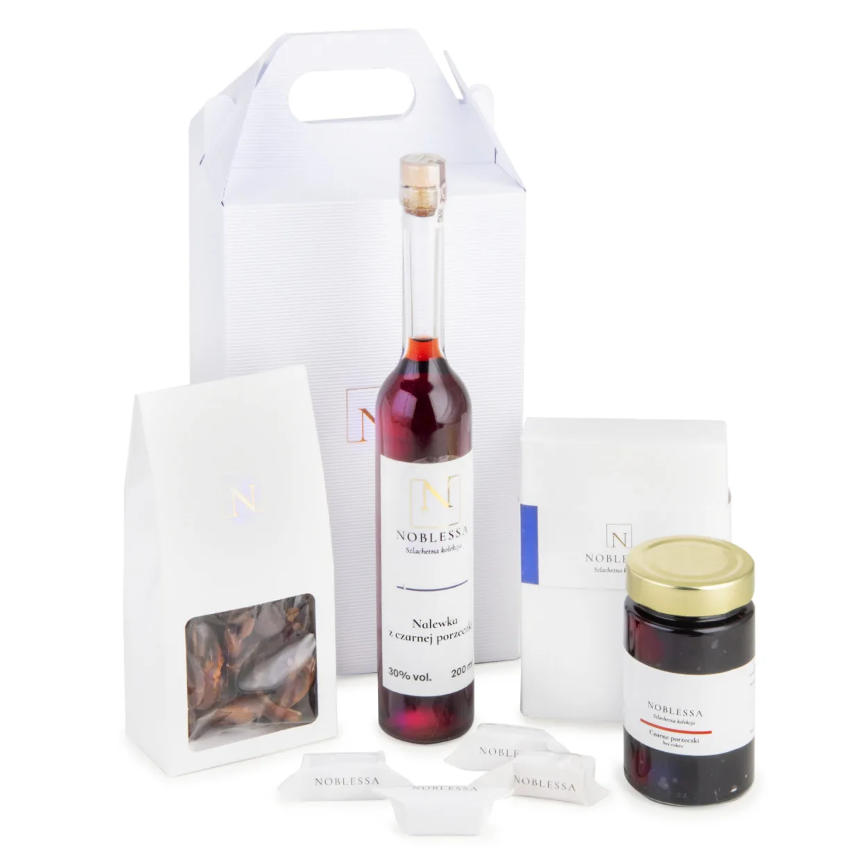 • Całość w eleganckim pudełku z białej tektury falistej z wygodnym uchwytem do wręczania.