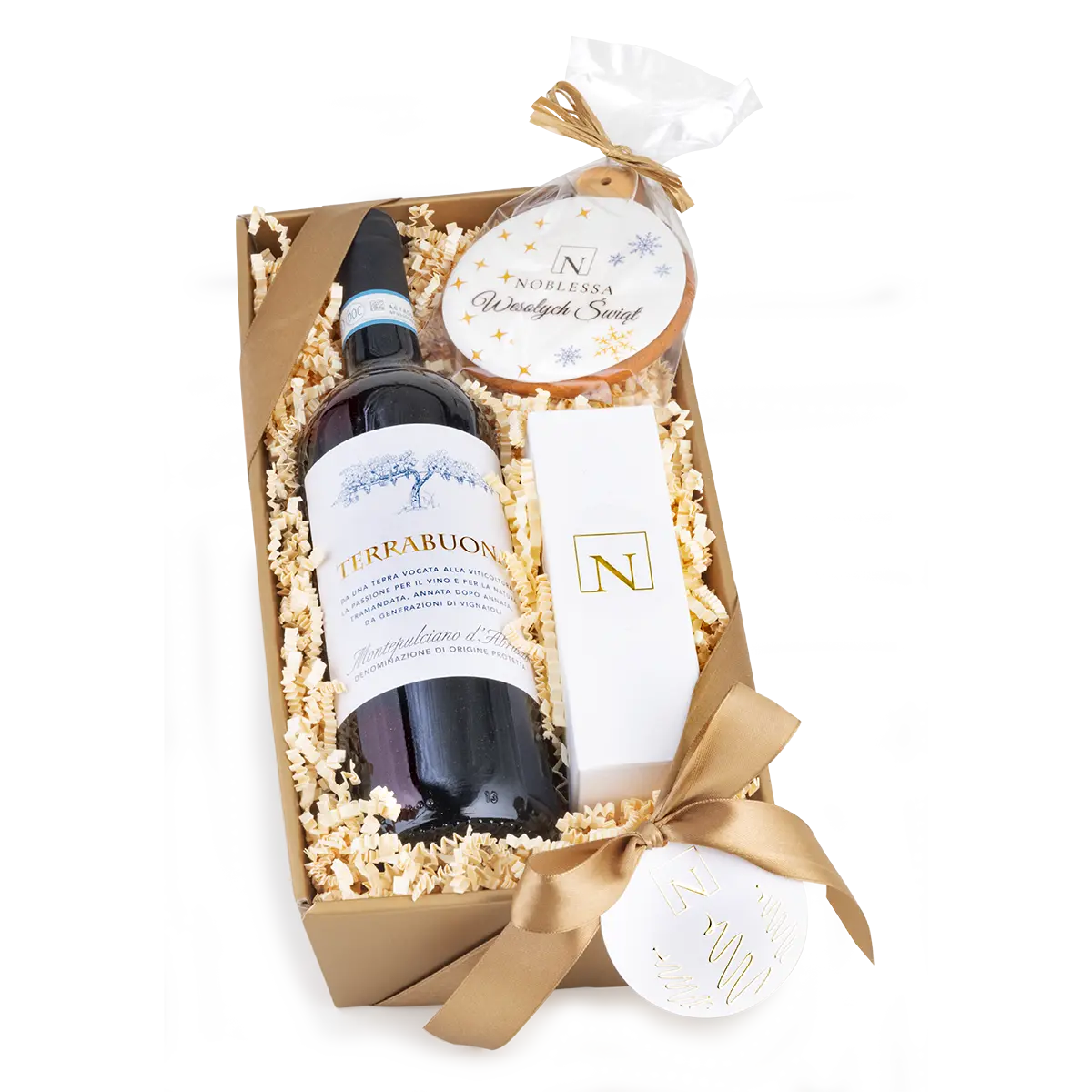 • Całość w eleganckiej złotej tacy z wypełnieniem i karnetem świątecznym.