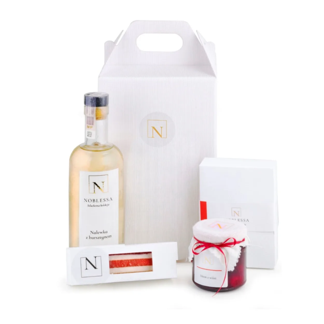 • Całość w eleganckim pudełku z białej tektury falistej z wygodnym uchwytem do wręczania