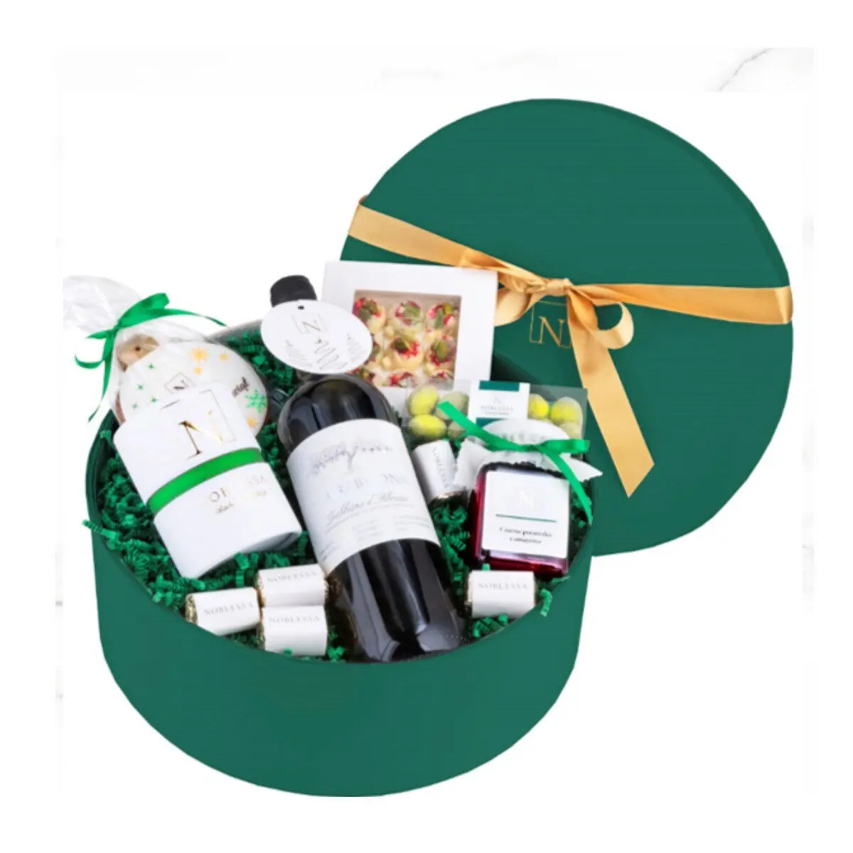 • Całość w luksusowym ręcznie wykonanym okrągłym kufrze przewiązanym wstążką w dowolnym kolorze.