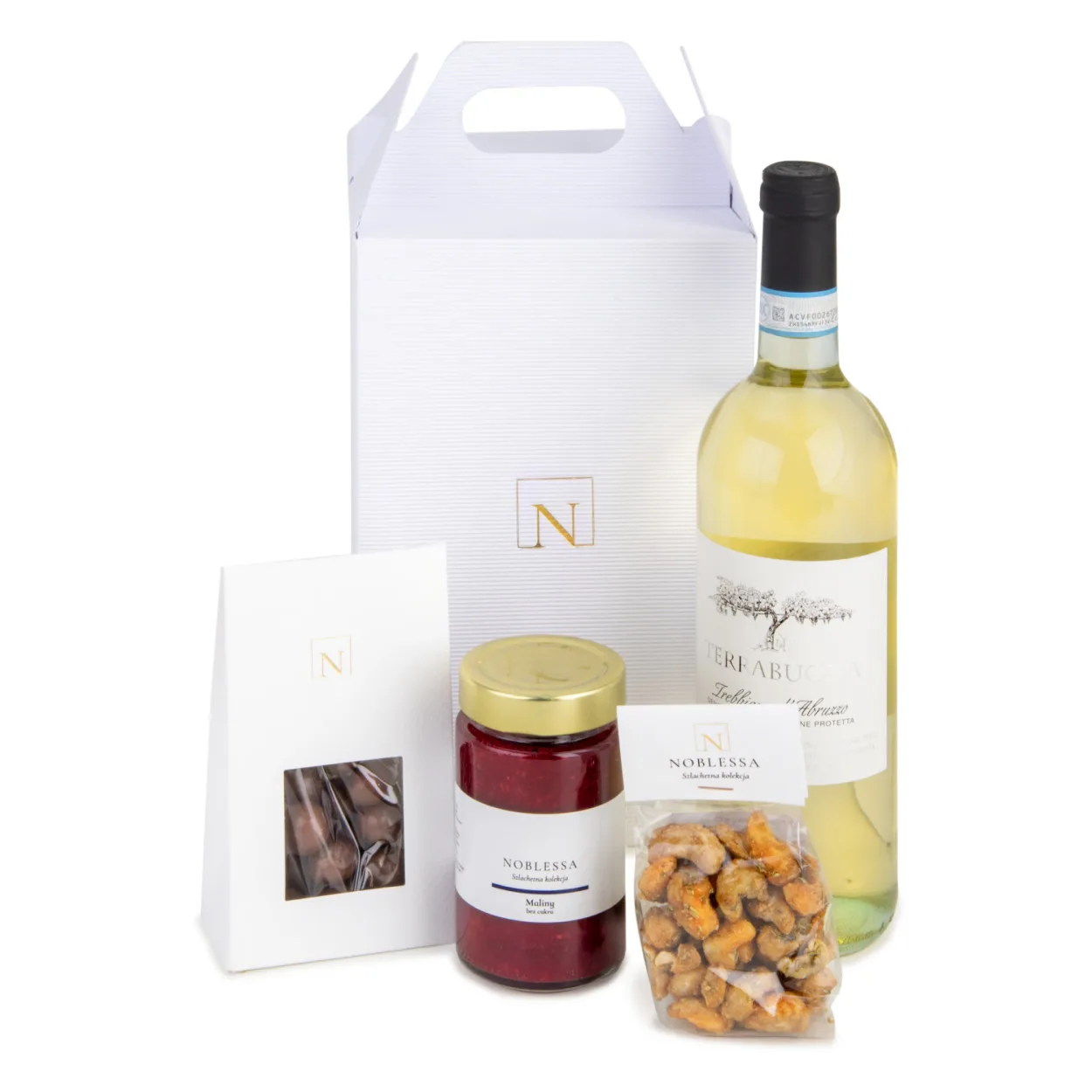 • Całość w eleganckim pudełku z białej tektury falistej z wygodnym uchwytem do wręczania.