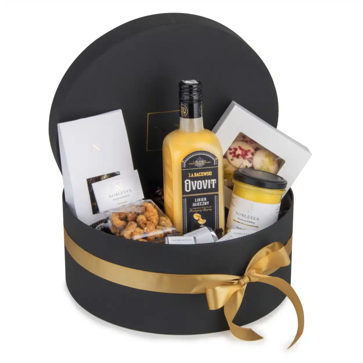 • Całość w luksusowym ręcznie wykonanym okrągłym kufrze przewiązanym wstążką w dowolnym kolorze.