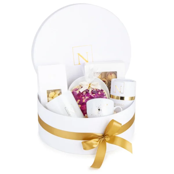 • Całość w luksusowym ręcznie wykonanym okrągłym kufrze przewiązanym wstążką w dowolnym kolorze.